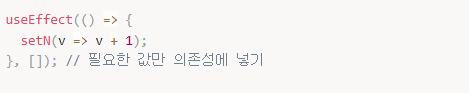 n을 직접 읽지 않고 setN(v => v + 1)처럼 함수형 업데이트를 쓰면 stale 클로저 문제를 피하면서도 의존성을 비울 수 있다.
