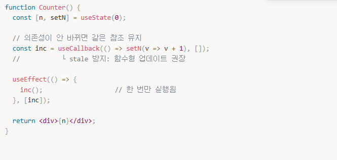 useCallback은 “참조 안정화”가 목적이다. 리렌더를 막지 않는다. 다만 “참조 비교”가 중요한 상황(자식에게 prop으로 넘길 때 React.memo와 함께, 혹은 effect 의존성에 있을 때)에서 이득이 있다.